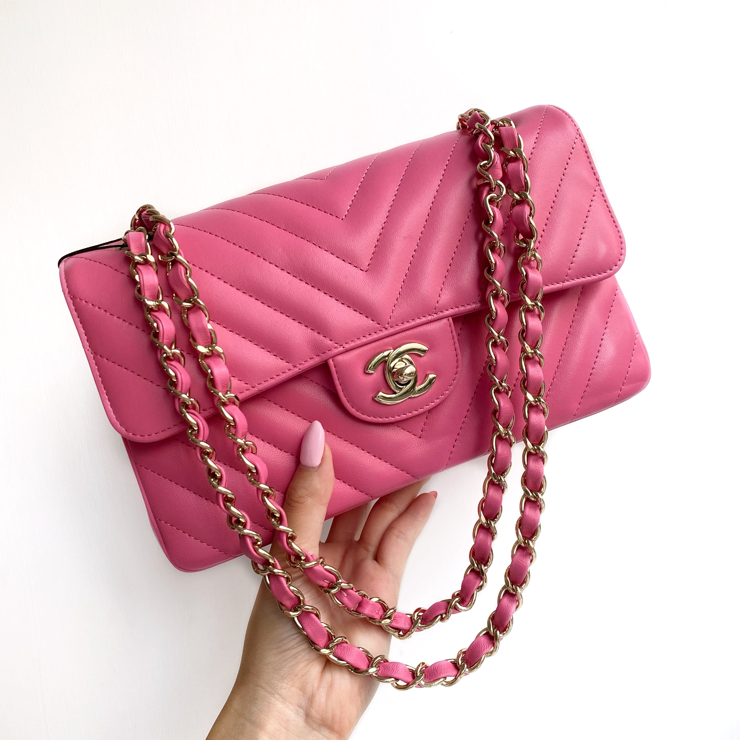 - Luxurious 19C barbie pink lambskin with gold-tone hardware